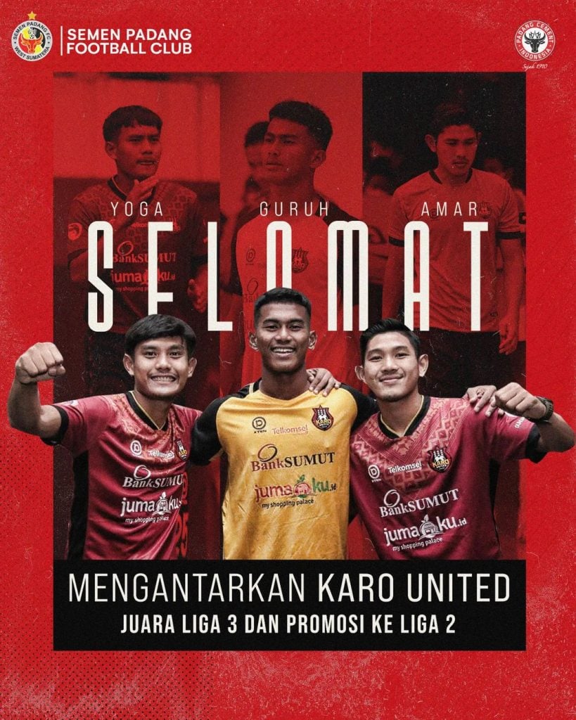 “Selamat Yoga, Amar dan Guruh yang telah membawa Karo United juara Liga 3 dan lolos ke Liga 2,” ungkap Semen Padang FC.