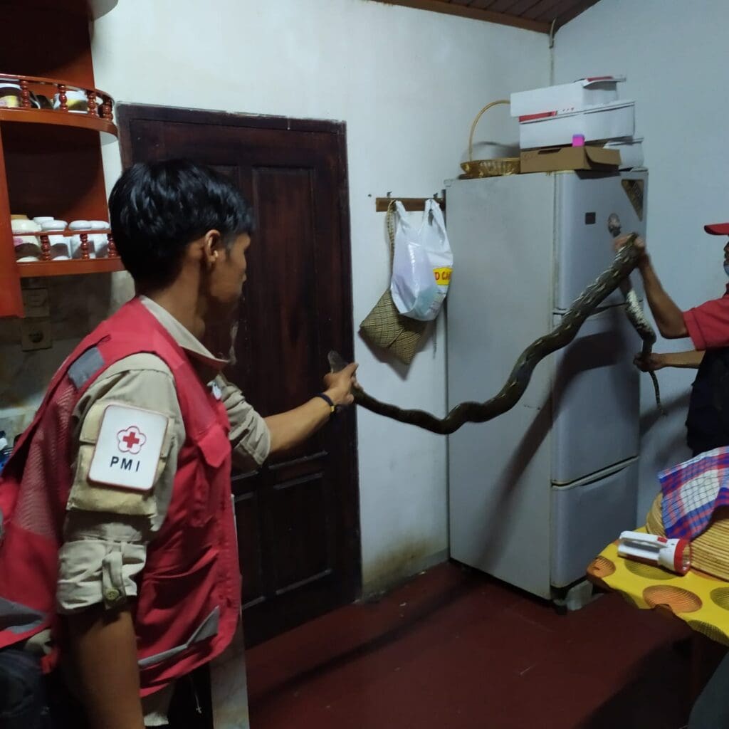 KATASUMBAR – Petugas PMI Bukittinggi mengevakuasi seekor ular piton sepanjang 3 meter yang masuk ke rumah warga.