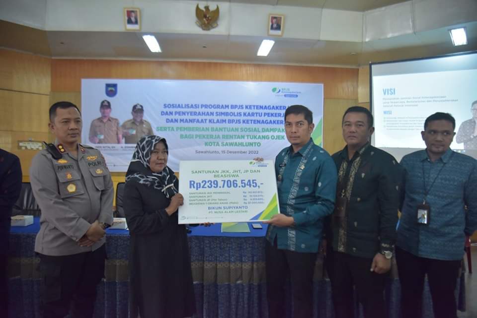 Penyerahan santunan secara simbolis tersebut dihadiri oleh Wali Kota Sawahlunto Deri Asta.