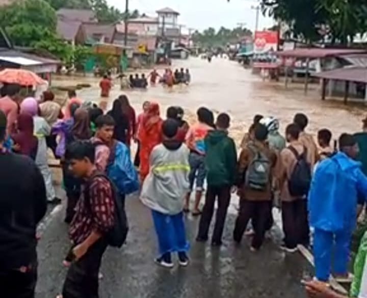 KATASUMBAR- Akses jalan nasional Padang–Bengkulu, tepatnya di Kampung Durian Pandaan, Nagari Air Haji, Kecamatan Linggo Sari Baganti, Kabupaten Pesisir Selatan, lumpuh total akibat banjir pada Kamis (27/11/2025) pagi.
