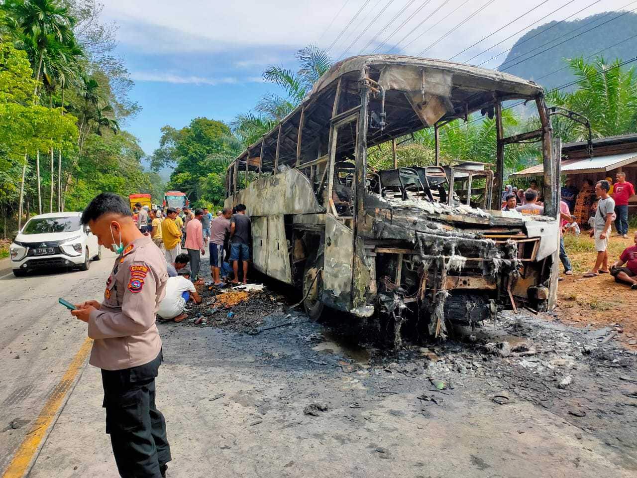 Bus tersebut diketahui terbakar pada Jumat (13/5/2022) sekitar pukul 08.40 WIB di Jorong Batang Dikek, Nagari Tanjung Lolo, Kecamatan Tanjung Gadang, Kabupaten Sijunjung.