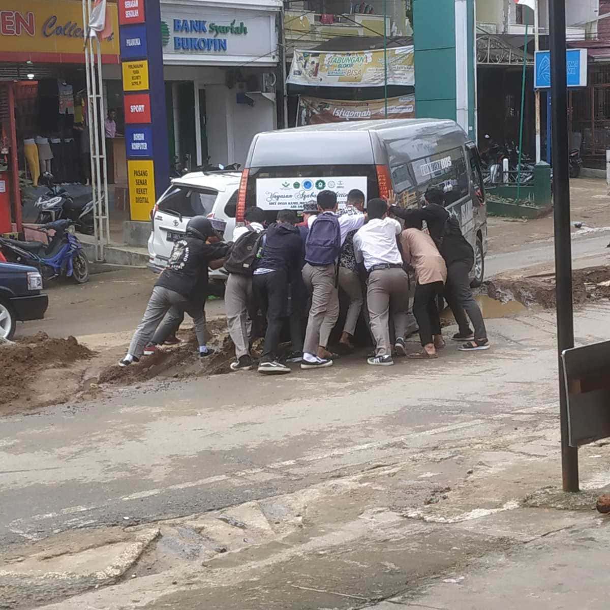 “Tidak lama terjebak, sekitar pukul 11.50 WIB, berhasil keluar setelah didorong secara bersama-sama,” ungkap Dina.