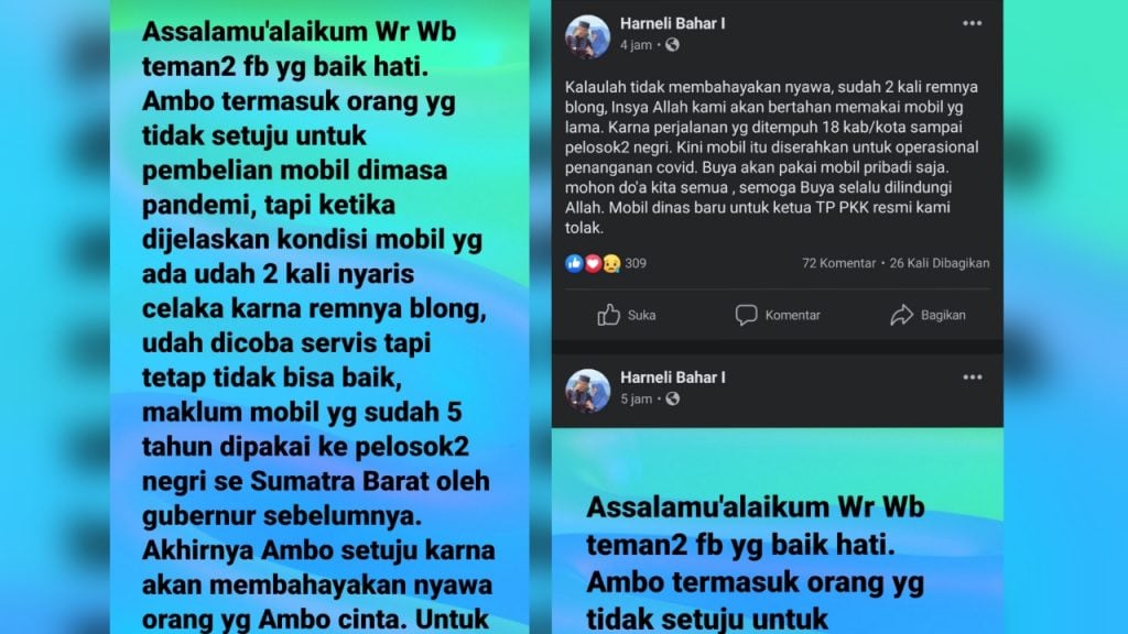Lewat akun Facebooknya, Harneli menceritakan pengalaman buruk Mahyeldi saat menggunakan mobil dinas peninggalan Gubernur Irwan Prayitno.