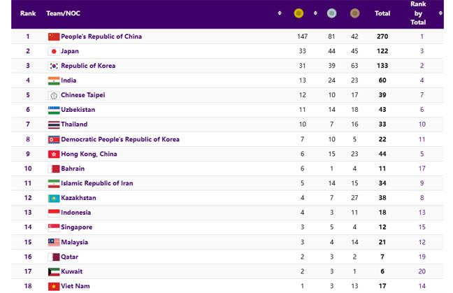 Untuk posisi pertama ditempati tuan rumah China yang sudah meraup total 270 medali, dengan rincian 147 emas, 81 perak dan 42 perunggu.