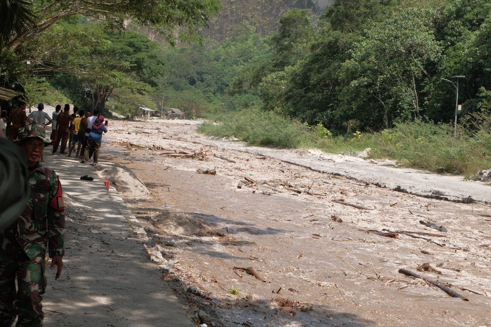 Jebolnya bendungan yang terbentuk akibat tebing yang longsor membuat aliran Sungai Batang Sianok meluap besar.