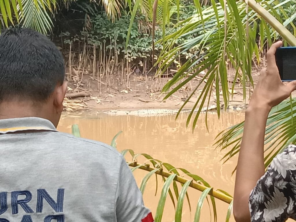 Menurut informasi warga, Ajis (50), penampakan buaya yang bernama latin Crocodylus porosus, terlihat dalam dua minggu ini.