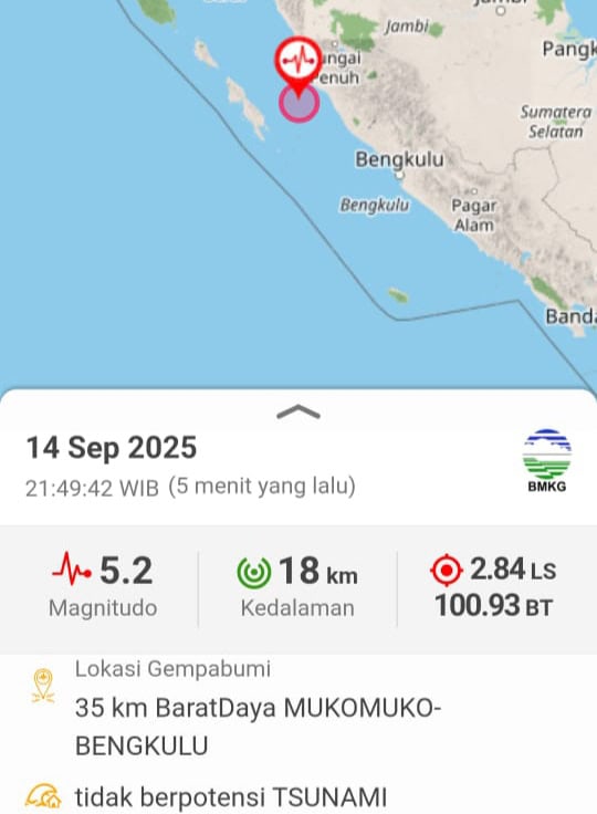 KATASUMBAR- Gempa bumi mengguncang Kabupaten Mukomuko, Bengkulu, Minggu (14/9/2025, malam.