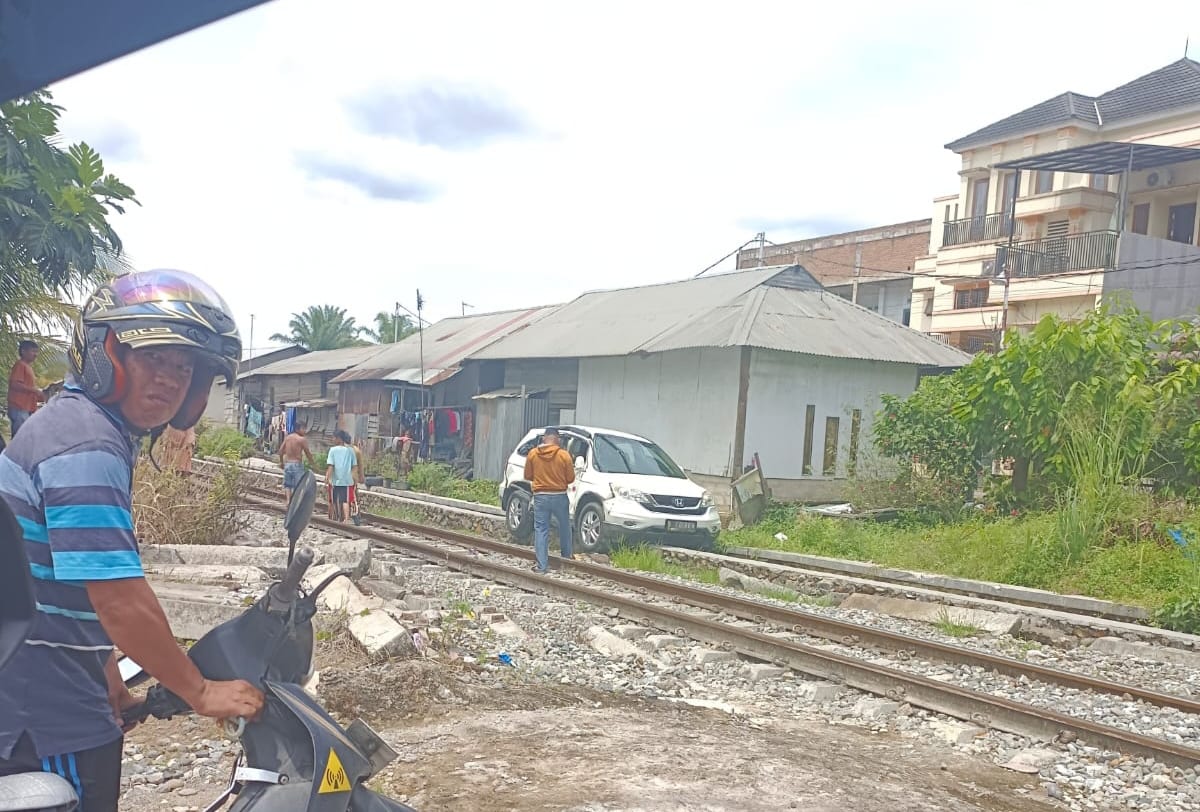 KATASUMBAR – Mati mesin di rel, mobil Honda CRV dihantam kereta api pengangkut semen di Jalan Jambak Indah, Kelurahan Koto Lalang, Kecamatan Lubuk Kilangan, Kota Padang.