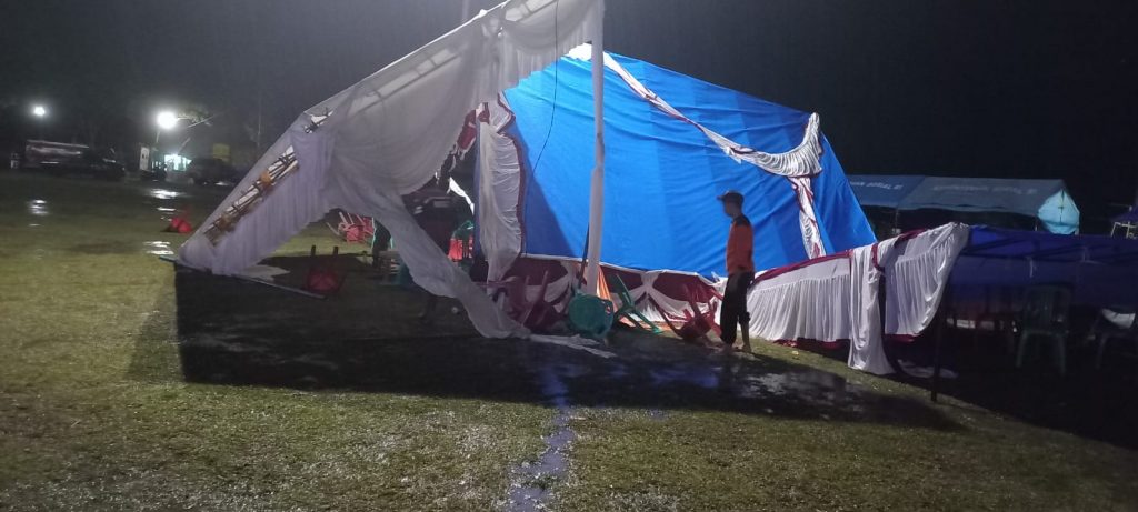 “Dampak kerusakan akibat hujan badai berupa robohnya tenda tamu utama dan tenda kafilah. Penyebabnya karena hujan badai,” ungkap Bambang.