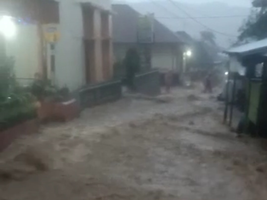 Saking besarnya air, kendaraan tak ada yang berani melintas dan air dilaporkan masuk hingga ke pemukiman warga.