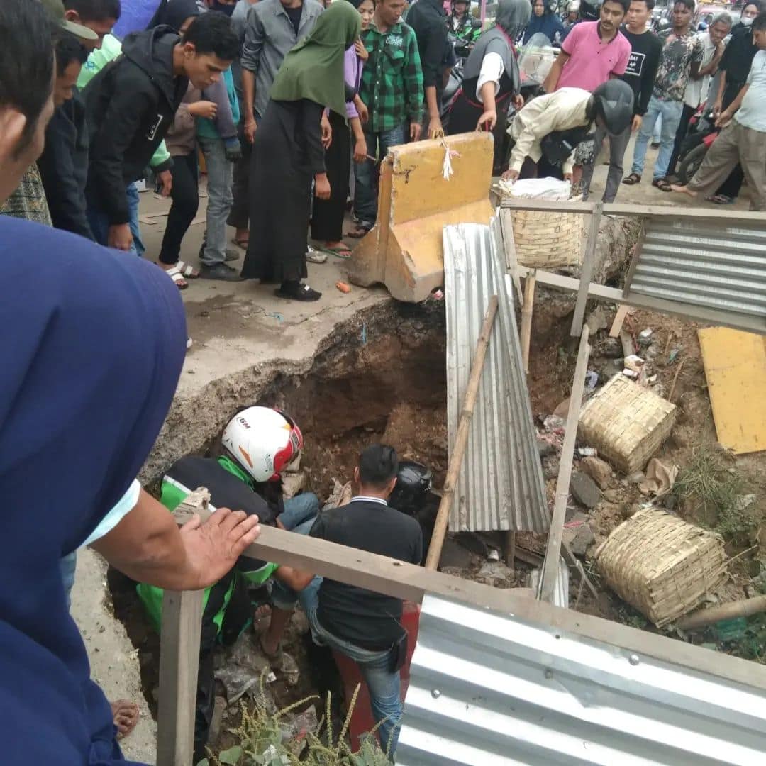 “Kejadian sekitar pukul 15.00 WIB tadi. Ada pengendara sepeda motor yakni ibu dan anaknya yang masih kecil masuk lubang,” ungkap Hendra dan Daniel, pedagang di lokasi.