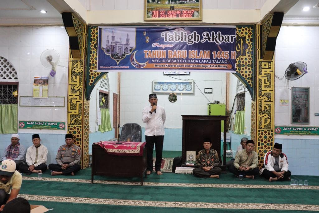 Melalui kegiatan Tabligh Akbar bersama Anak Nagari Lubuk Basung, Kapolres Agam memperingati tahun baru Islam 1 Muharram 1445 H di masjid Syuhada Lapau Talang, Lubuk Basung, Kamis 27 Juli 2023.
