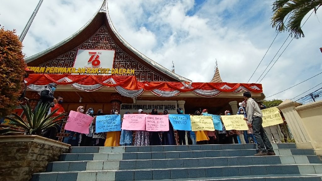 KATASUMBAR – Puluhan warga yang tergabung dalam Aliansi Bukittinggi Peduli melakukan orasi di depan Gedung DPRD Bukittinggi, Senin 23 Agustus 2021.