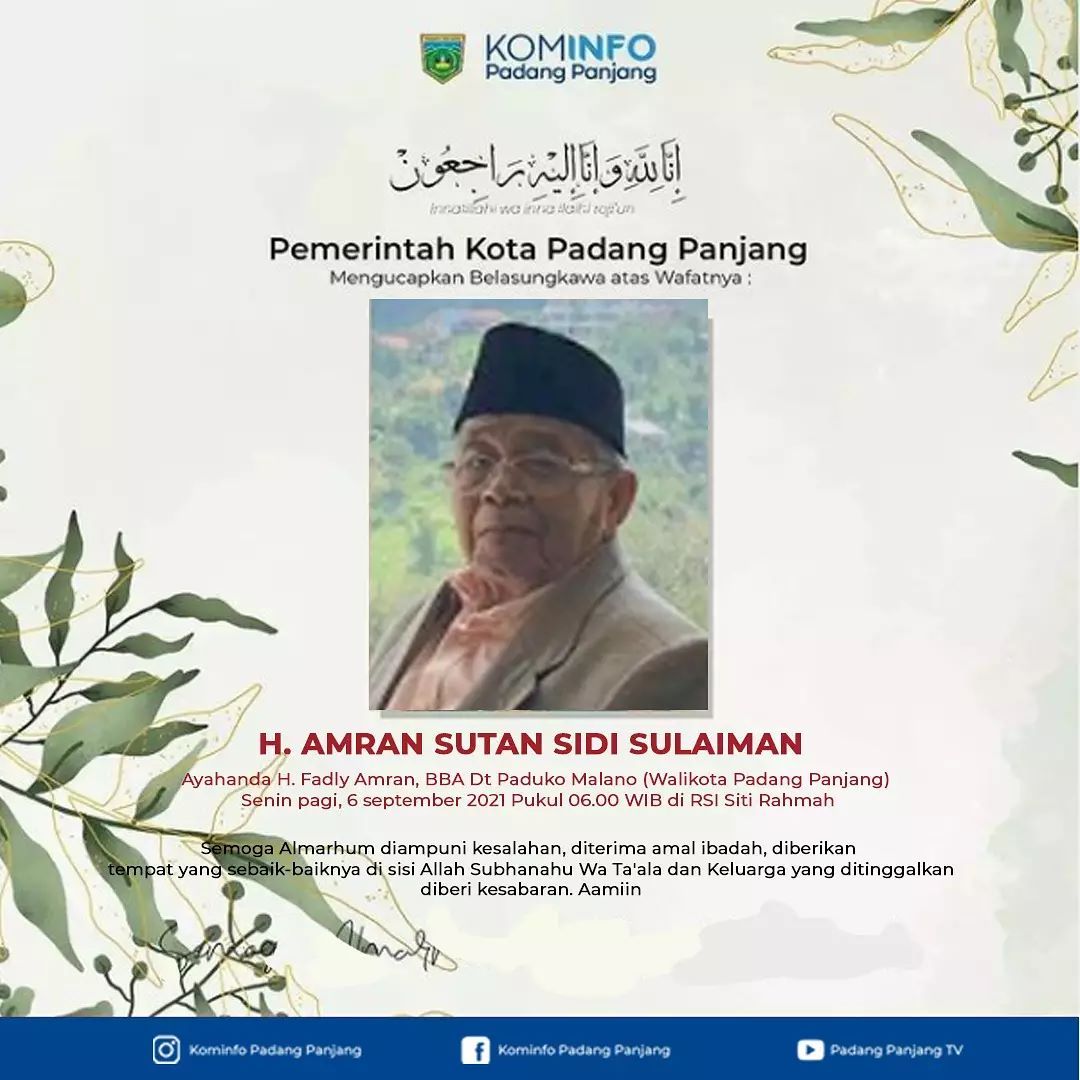 “Telah berpulang kerahmatullah Bapak H.Amran, ayah dari Wali Kota Padang Panjang,” sebut Kominfo.