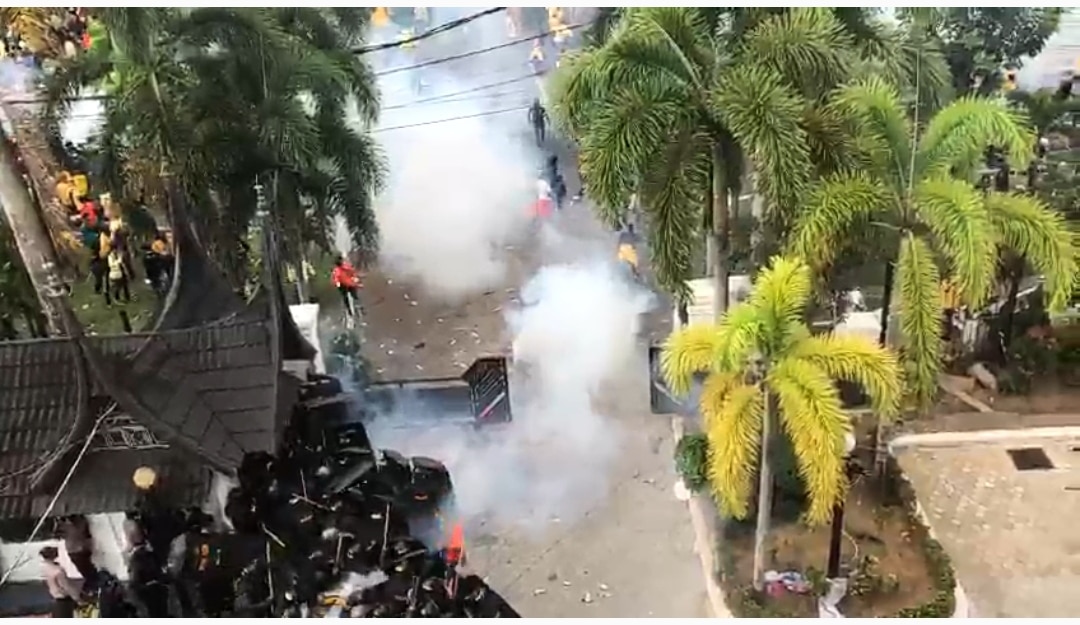 Polisi terpaksa menembakkan gas air mata saat kericuhan terjadi untuk membubarkan mahasiswa yang sudah mendorong pintu timur untuk memaksa masuk gedung DPRD Sumbar.