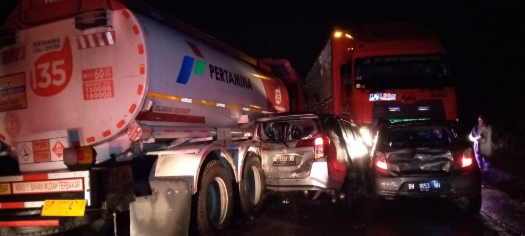 Diketahui kecelakaan melibatkan mobil tangki pengangkut Bahan Bakar Minyak (BBM) yang menghantam mobil sedan dan minibus didepannya