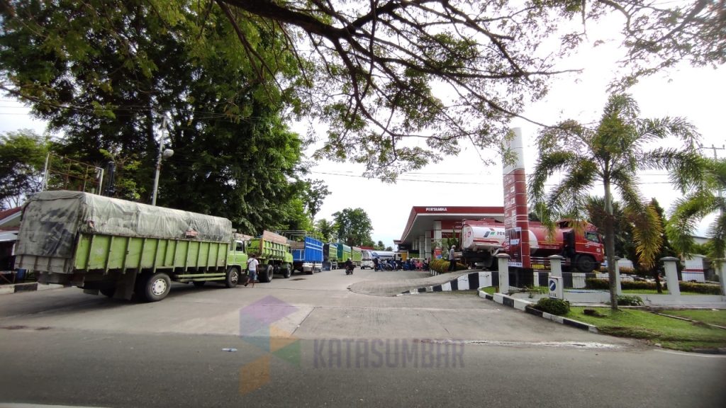 KATASUMBAR – Antrean truk mengular di sejumlah Stasiun Pengisian Bahan Bakar Umum (SPBU) di Kota Padang.