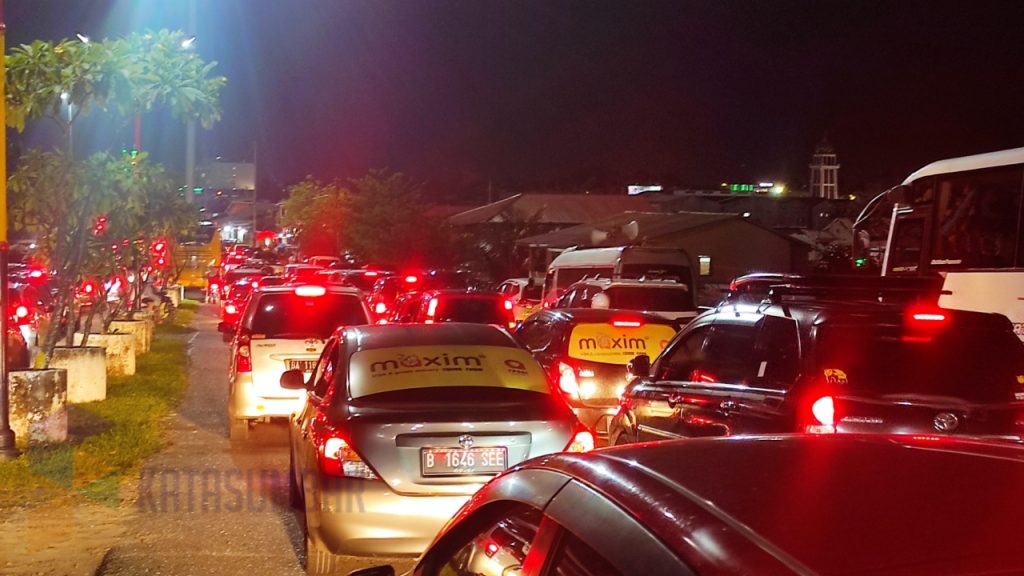 Kemacetan mengular dari Danau Cimpago hingga depan Hotel Pangeran Beach.