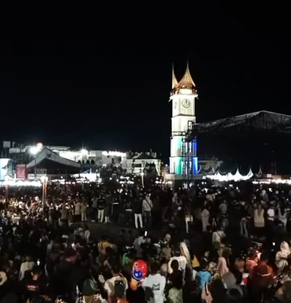 KATASUMBAR – Ribuan pengunjung memadati Jam Gadang Bukittinggi saat momen pergantian tahun baru 2022 ke 2023.