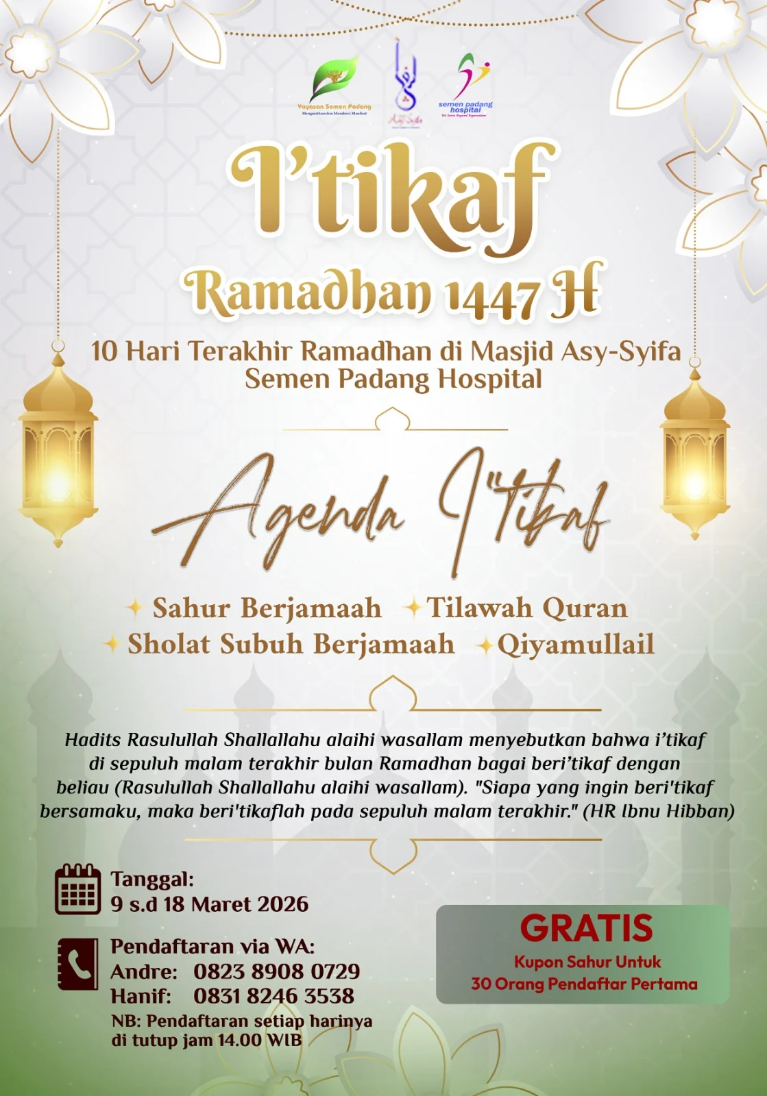 KATASUMBAR – Masjid Asy-Syifa Semen Padang Hospital (SPH) mengadakan kegiatan I’tikaf Ramadan 1447 Hijriah yang dilaksanakan pada sepuluh hari terakhir bulan suci Ramadan. Kegiatan ini berlangsung mulai 10 hingga 18 Maret 2026.