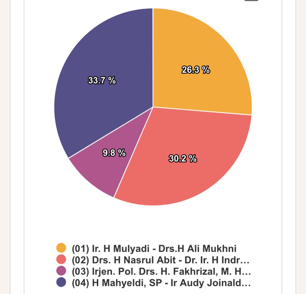 Mahyeldi -Audy Joinaldi masih unggul dari perolehan sementara sebesar 33,7 persen atau 362.705 suara, Nasrul Abit 30,2 persen atau 352.280 suara.
