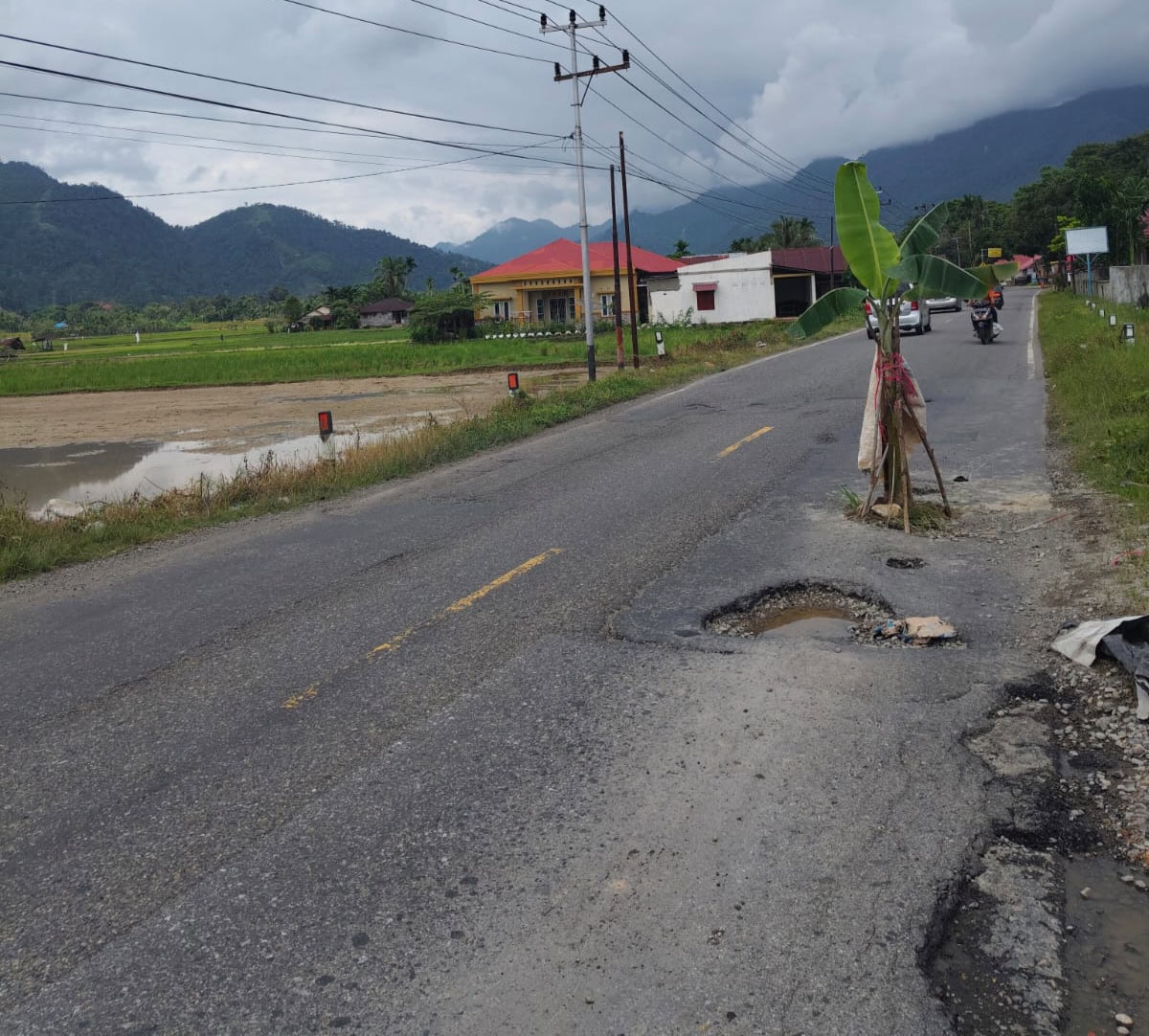 Pantauan Klikpositif, Minggu 2 Maret 2025, siang, jalan nasional yang ditanam pohon pisang oleh warga ini, terdapat di kawasan Nagari Batu Hampa, Koto XI Tarusan.