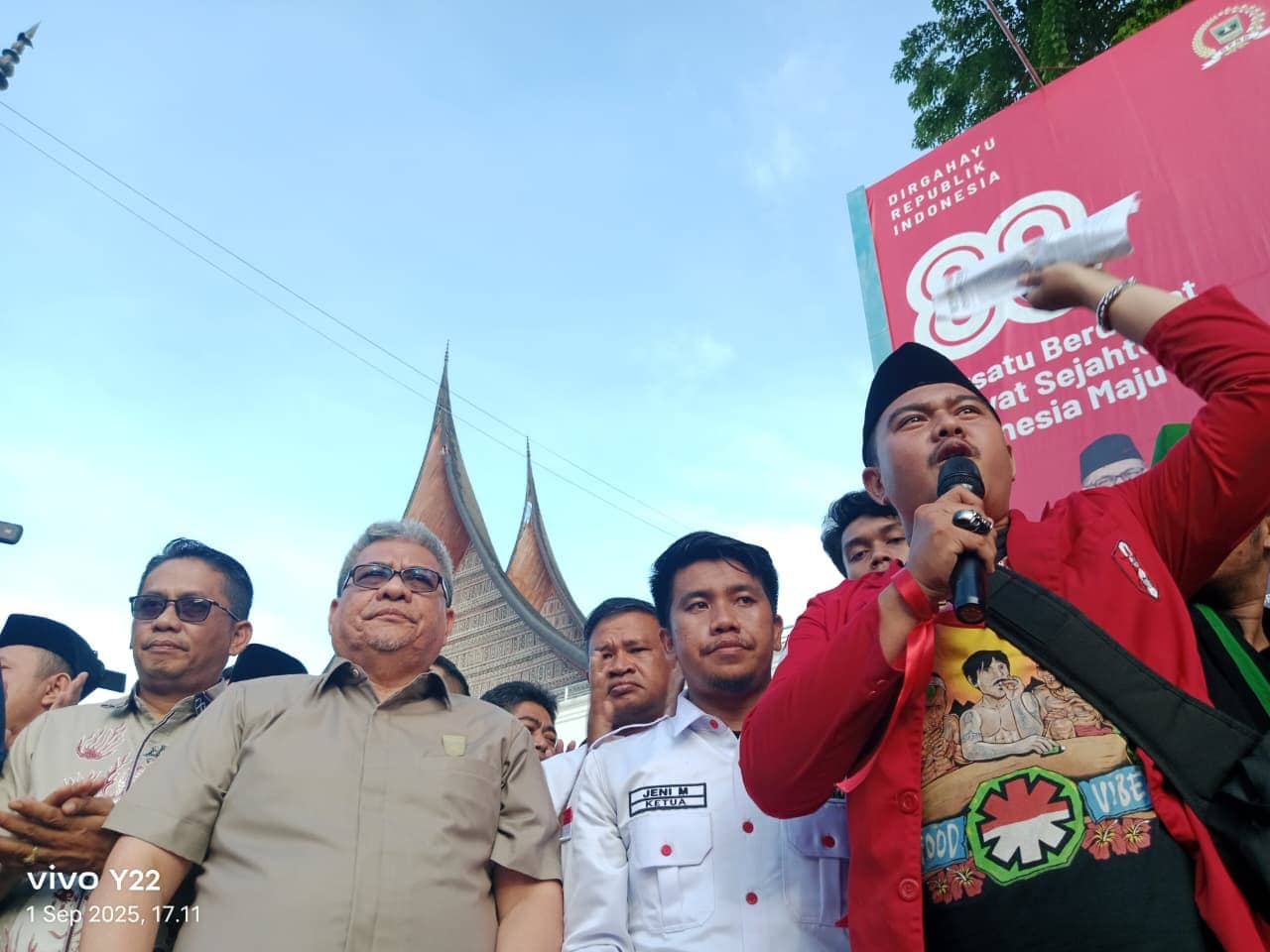 KATASUMBAR- Massa aksi mahasiswa dan masyarakat sipil Sumatera Barat, membubarkan diri, setelah perwakilan aksi ditemui Ketua DPRD Sumbar, Muhid i, Senin 1 September 2025, sore.