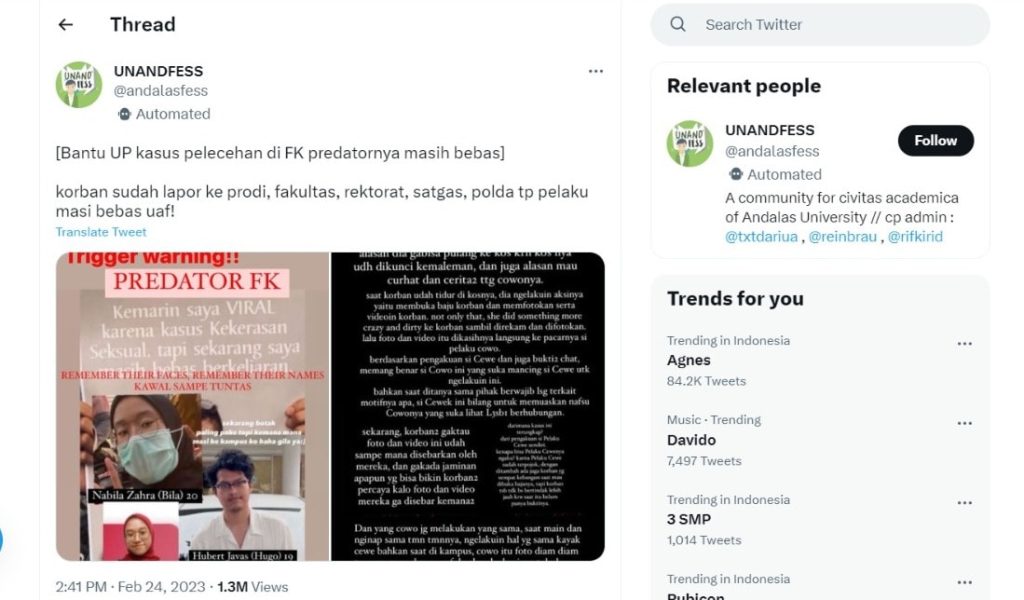 “Selanjutnya Satgas PPKS juga telah mengajukan surat penonaktifan kedua terlapor ke pimpinan universitas. Saat ini sedang merumuskan rekomendasi terhadap kasus ini,” katanya lagi.